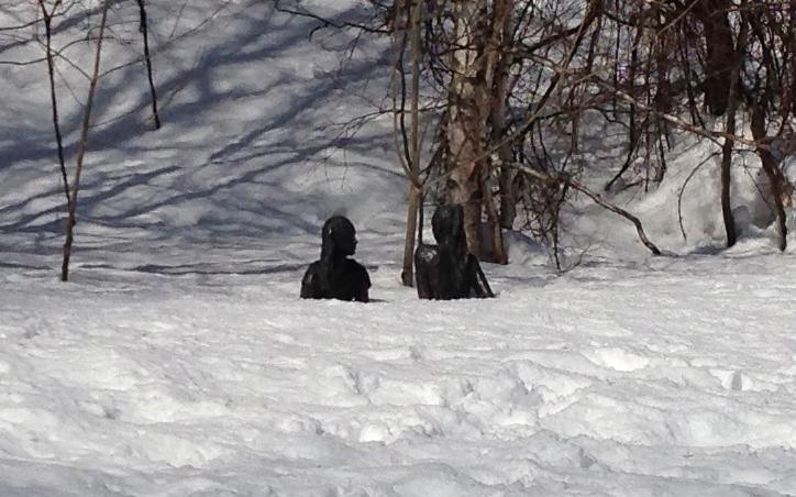 1メートル近くの積雪があるため、夏場とは違う角度から彫刻を見ることができるのもおもしろい。 半分以上雪に埋もれた彫刻もあり、とても寒そう。