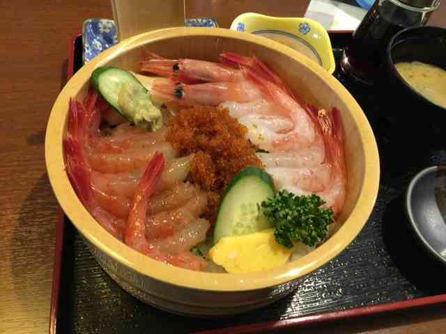 甘エビのしょうゆ漬けと甘エビの刺身がはんぶんずつ乗った豪華エビづくしの丼が登場。