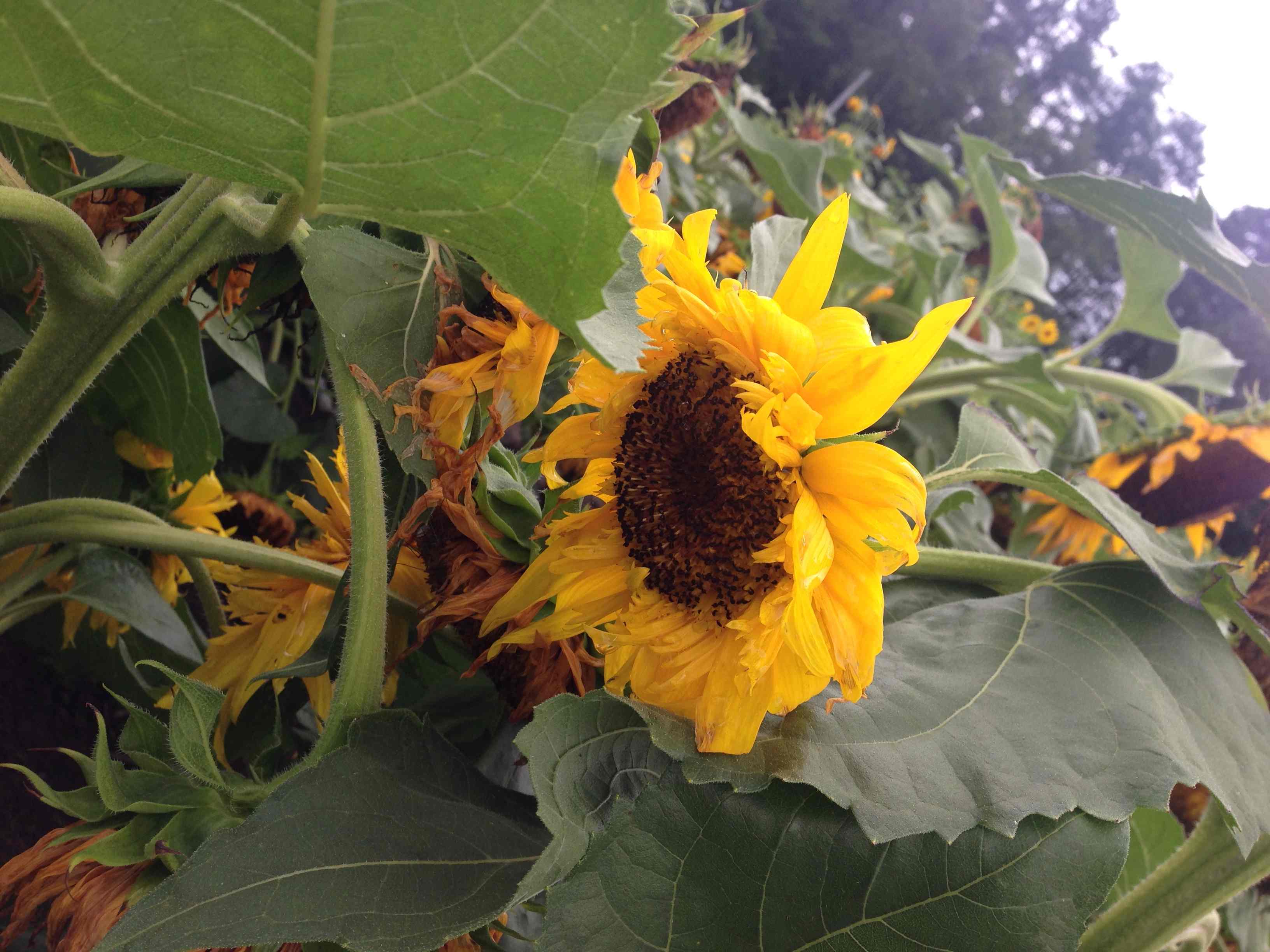 曇りで時折雨がパラつくあいにくの天気でも、ひまわりは割と元気に咲いている。